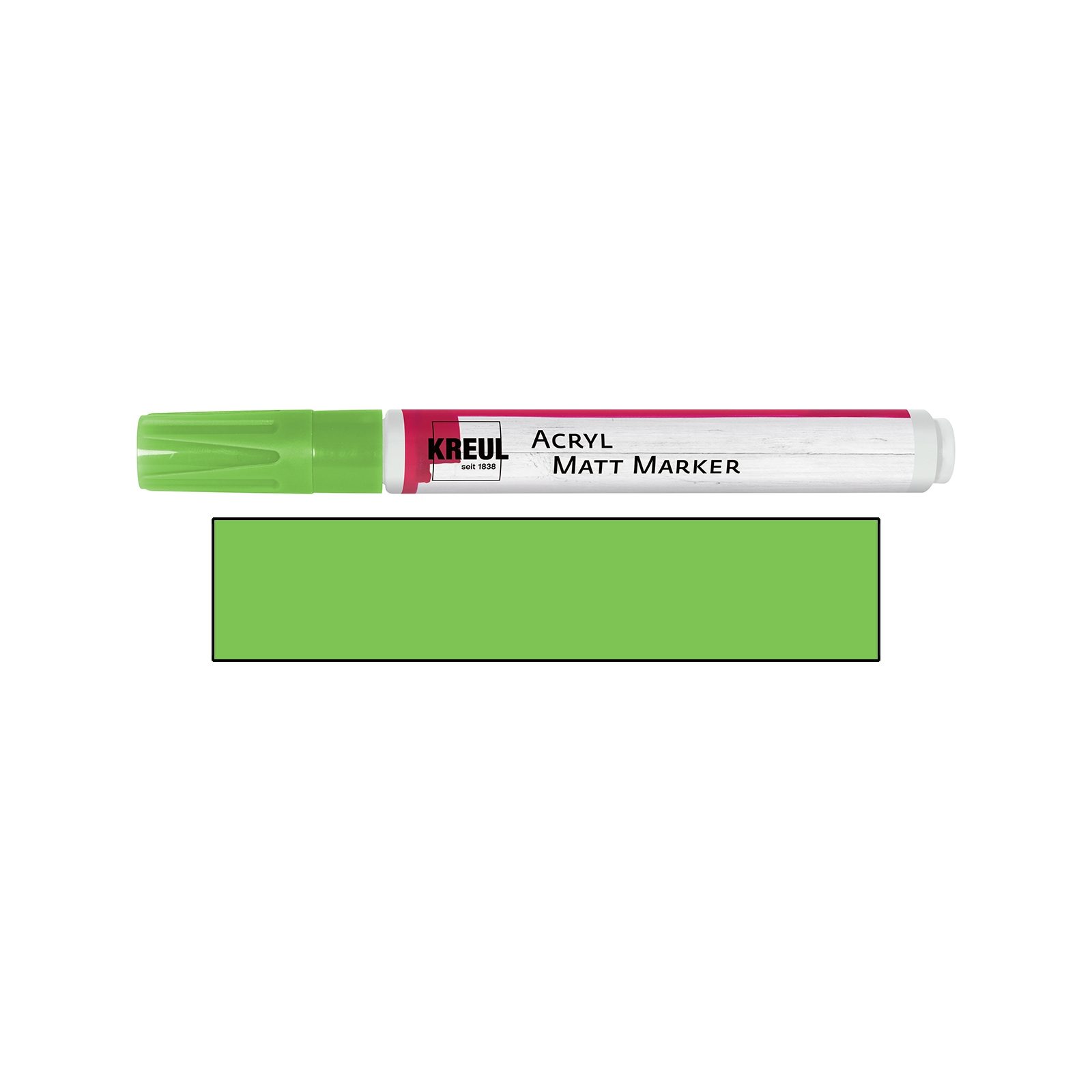 Acrylic matt marker KREUL medium green is an opaque marker with a medium-size round tip that makes lines with the width of approx. 2 - 4 mm. This marker is filled with matt acrylic paint suitable for wood, cardboard, paper, polystyrene, glass, clay, metal, plastic, rubber or concrete. The surface has to be dry and without any dust. The paint often covers already with the first stroke. Using the marker, you can decorate objects as well as paint pictures.