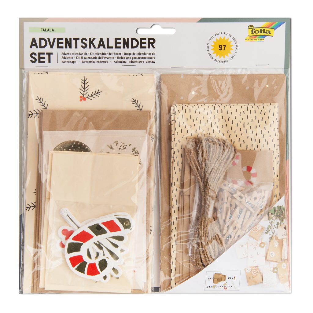 The package contains 24 paper bags (9 bags 12 x 6 x 21 cm, 9 bags 10 x 5.5 x 17.5 cm, 6 bags 8 x 4.5 x 13 cm), 24 wooden pegs, 24 paper decorations, 24 sticker for day numbers and string. The picture of the hanging calendar is illustrative, the package does not contain a circle, paper ornaments, dried flowers or other decorations. The set does not include gifts, you have to add them to the bags yourself (or you can ask the Christmas elf).