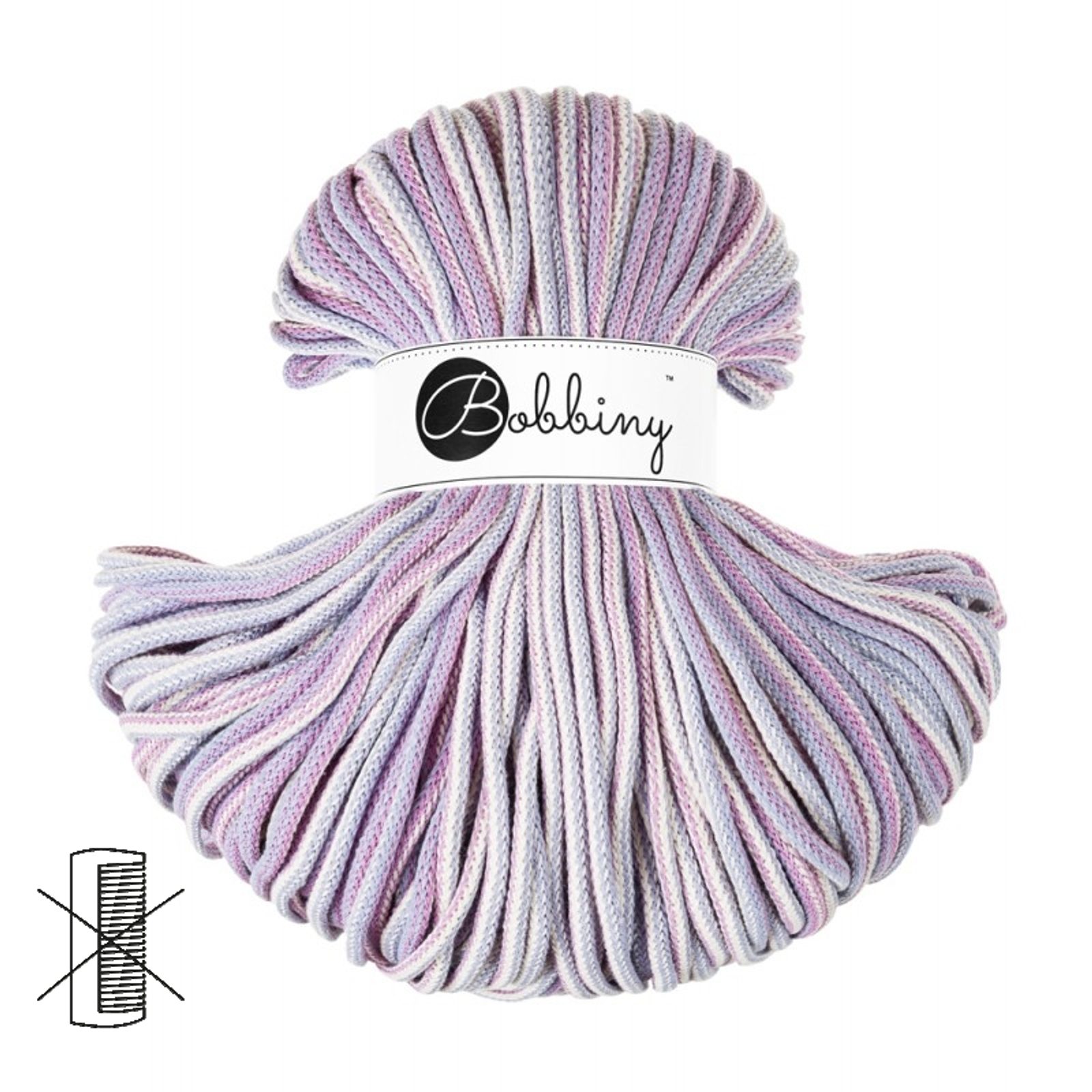 Bobbiny Macramé Cord Premium 5mm Magic Iris is a braided cord made from 100% recycled cotton using a braiding technique with a strong cotton core. Braided cord cannot be untangled. It’s suitable for crocheting as well as knitting with a size 6 - 8 mm hook. Thanks to being so firm, it’s used for more substantial decorations and utility items, such as baskets, table mats or coasters, rugs as well as handbags or bags.