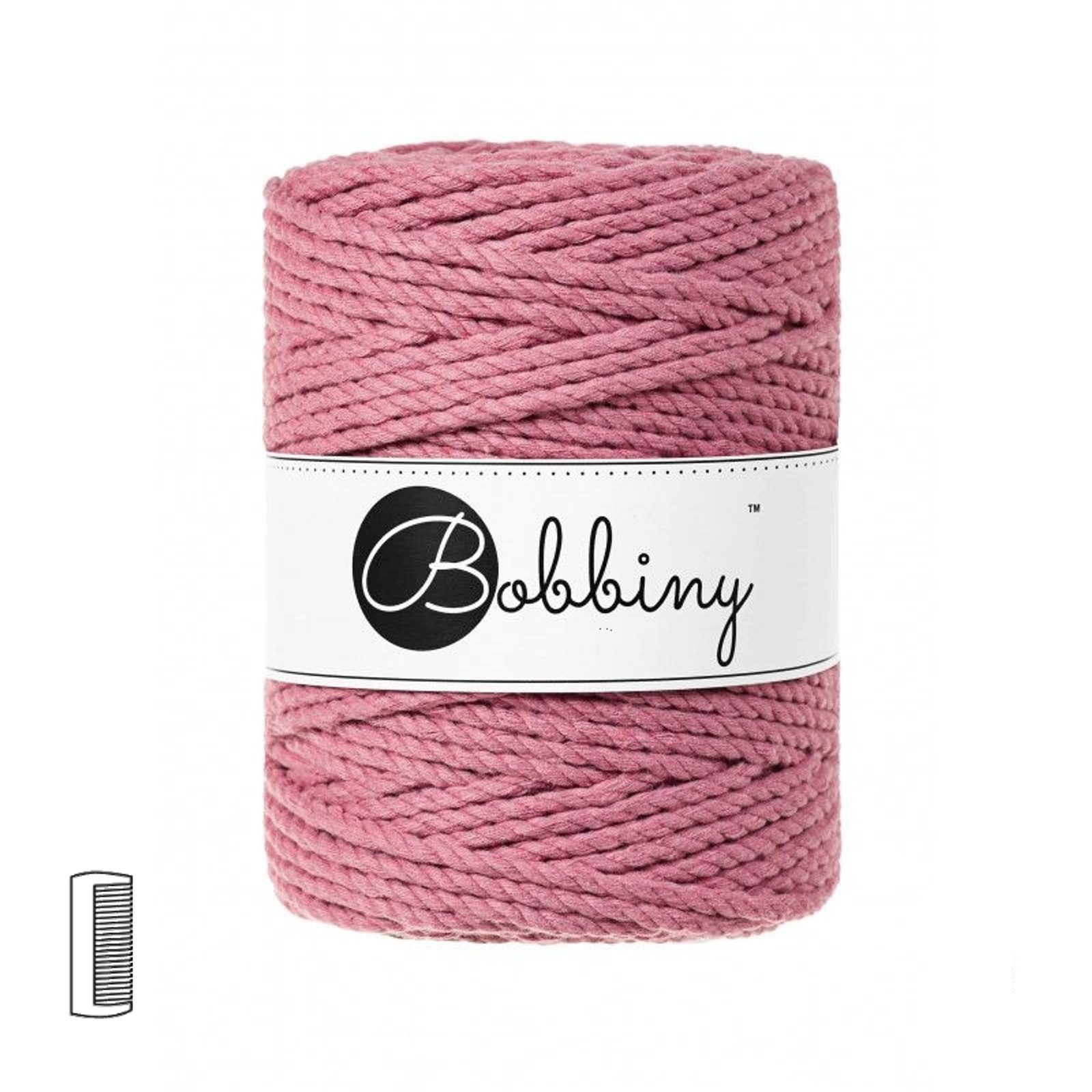 Bobbiny Macramé Rope XXL 3PLY 5mm Blossom is made from recycled cotton including the inner spool made from recycled paper. It can be combed out. Triple twist rope composed of three 20-thread cords is firmer but can also be pulled apart easily for individual cord use. It's used for making decorations with a more rustic character.