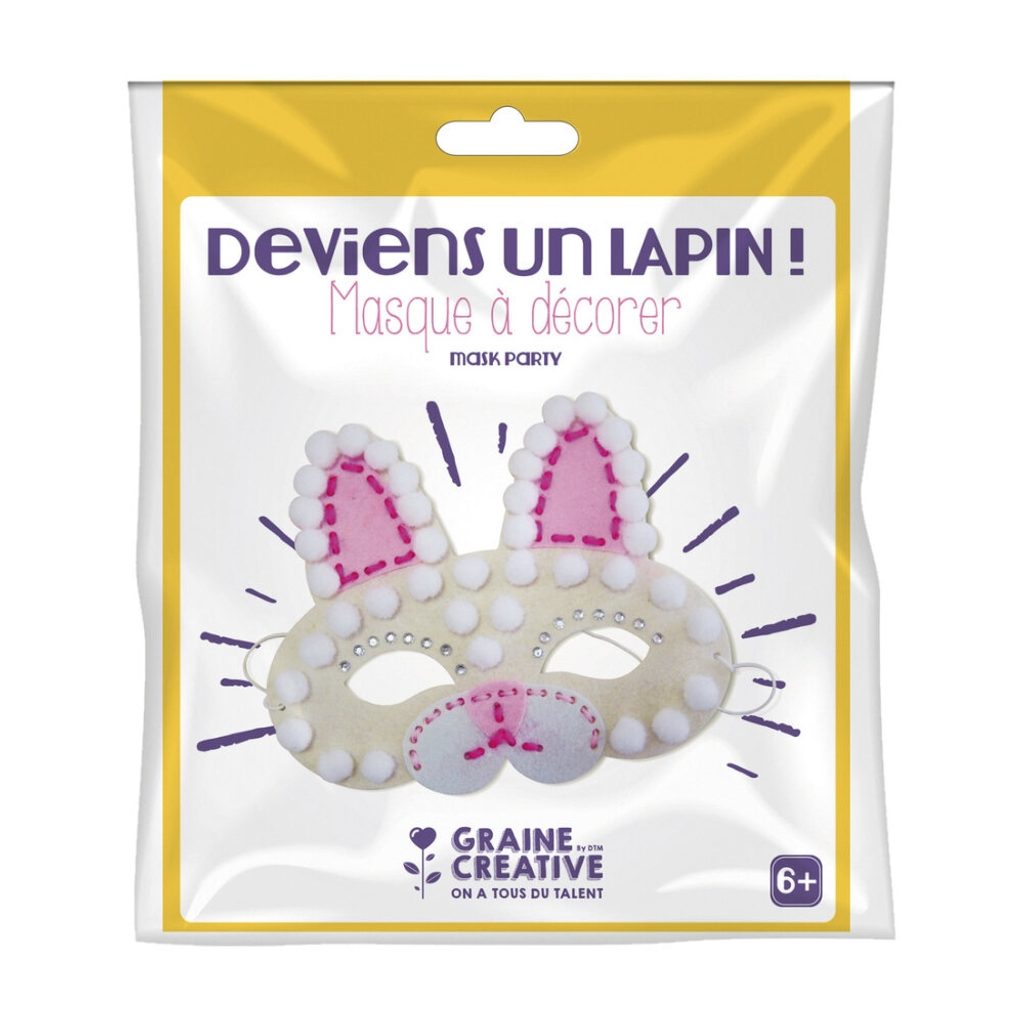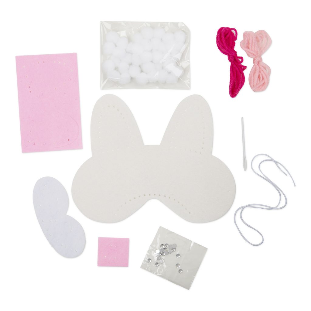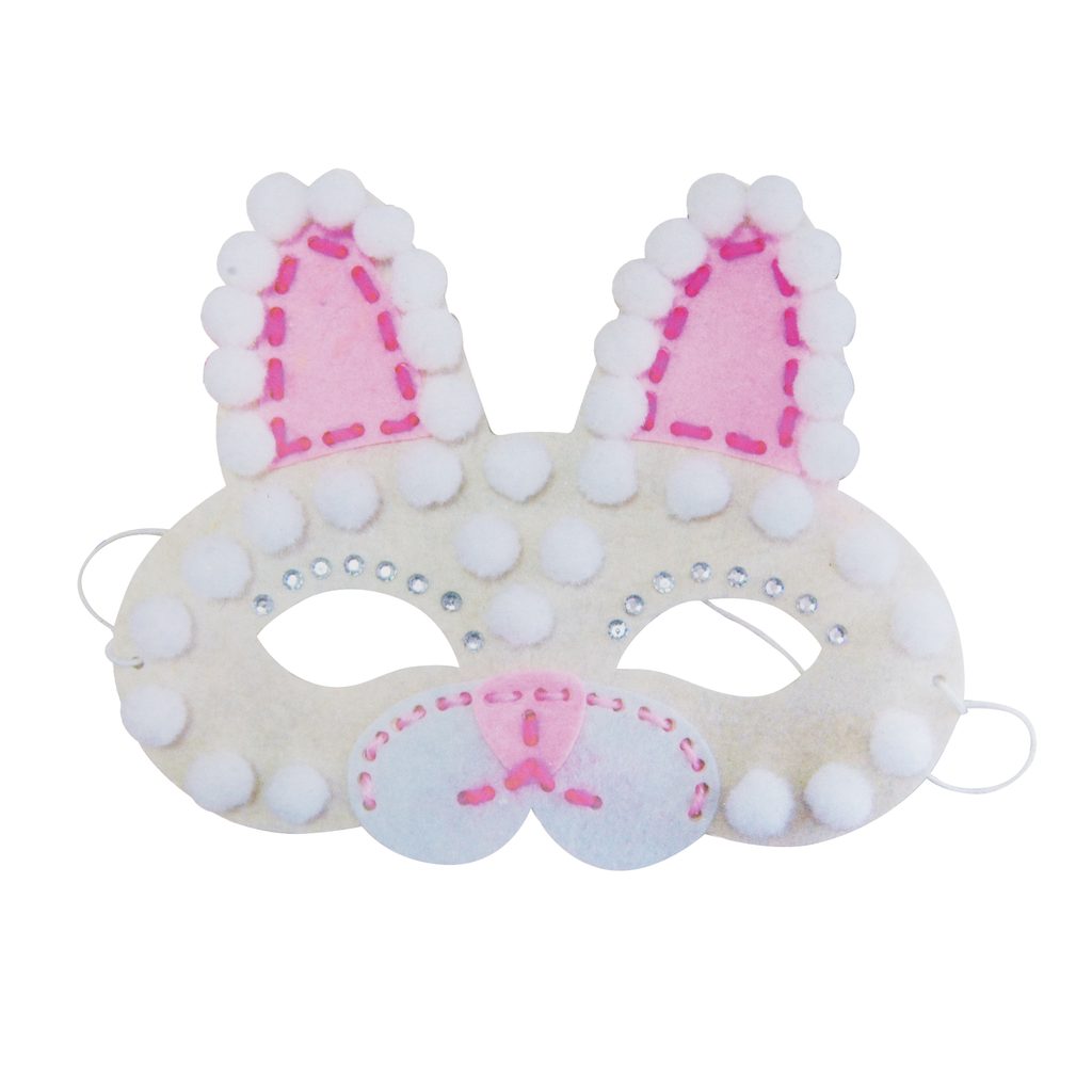 Create an original 3D mask for carnivals or fancy-dress balls and become a bunny! This set contains a felt mask base, decorative pom-poms (white), 2 yarns (light and dark pink), a blunt plastic needle, an elastic band for fastening and instructions.