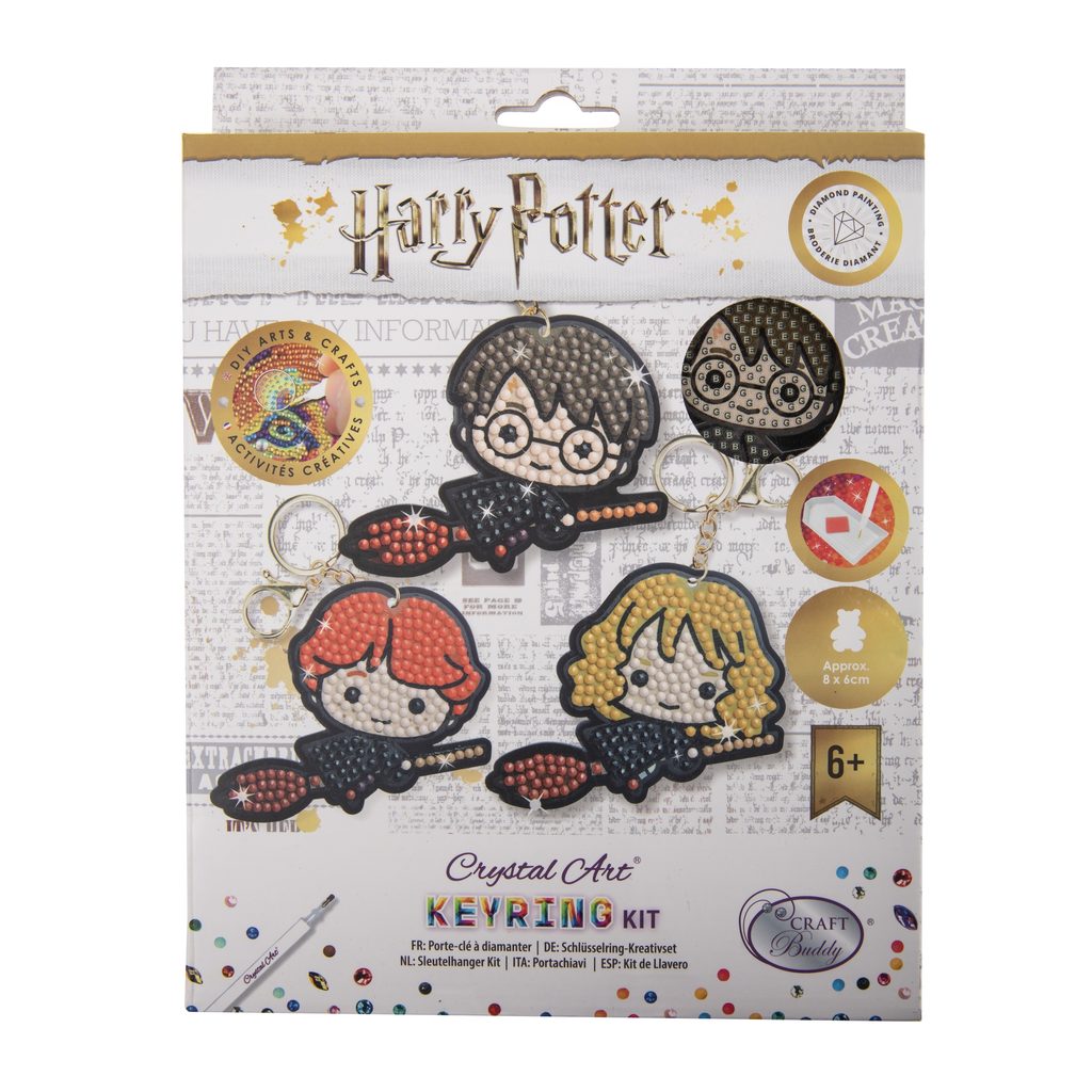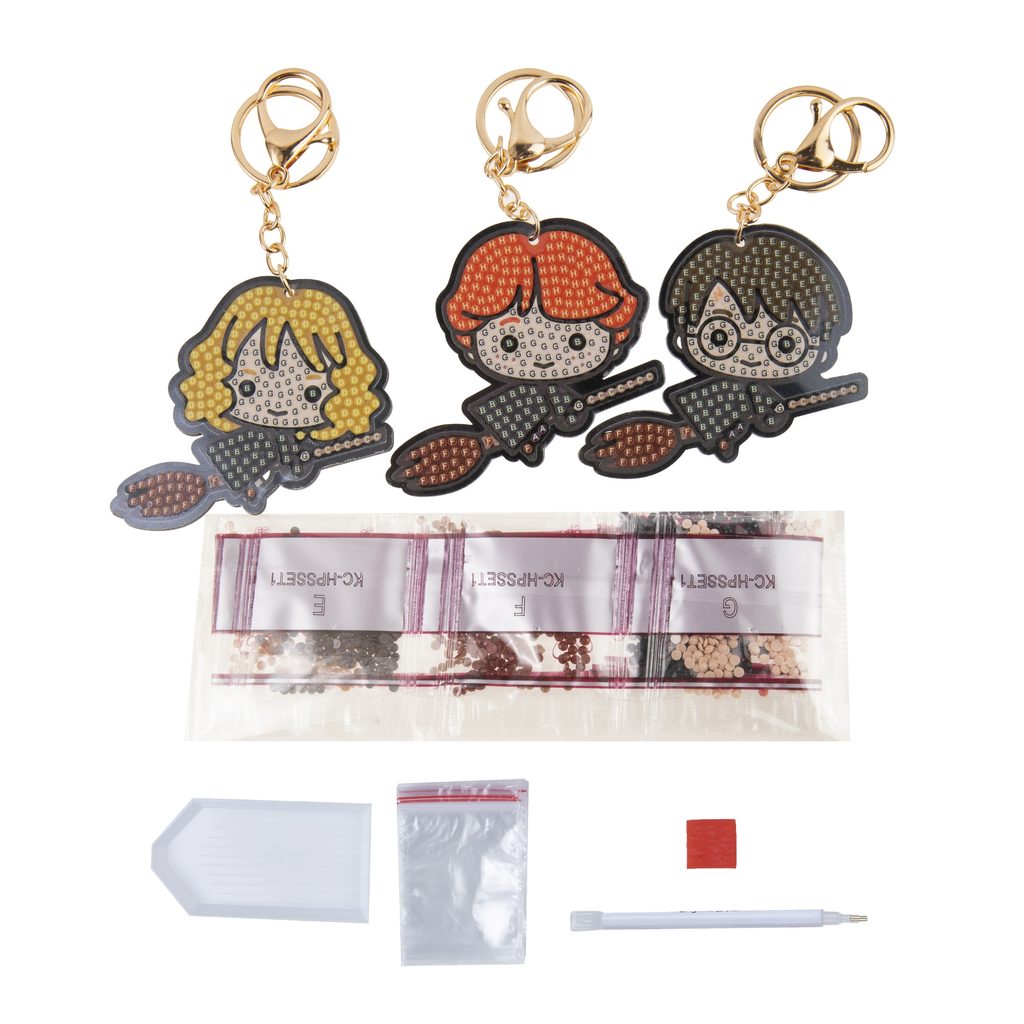 Vytvořte si sadu klíčenek s Harrym Potterem technikou diamantového malování, tedy lepením barevných kamínků na předpřipravený vzor. Na samolepicí destičce jsou vyznačené jednotlivé barvy kamínků, které je třeba použít. Stačí si jen vybrat vzor, vzít do ruky aplikátor a začít tvořit. Když bude dílo hotové, nezapomeňte kamínky rovnoměrně přitlačit na destičku (třeba špachtlí, válečkem nebo případně knihou), abyste se ujistili, že jsou všude stejně kvalitně přilepené. Aplikování kamínků je velmi snadné. Do hrotu aplikátoru si můžete nabrat trochu vosku z voskového čtverečku a diamanty pak budou v aplikátoru hezky držet. Hotový výrobek můžete zavěsit na přiloženou klíčenku a dílko si tak nosit sebou.
