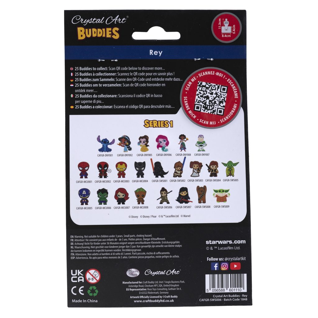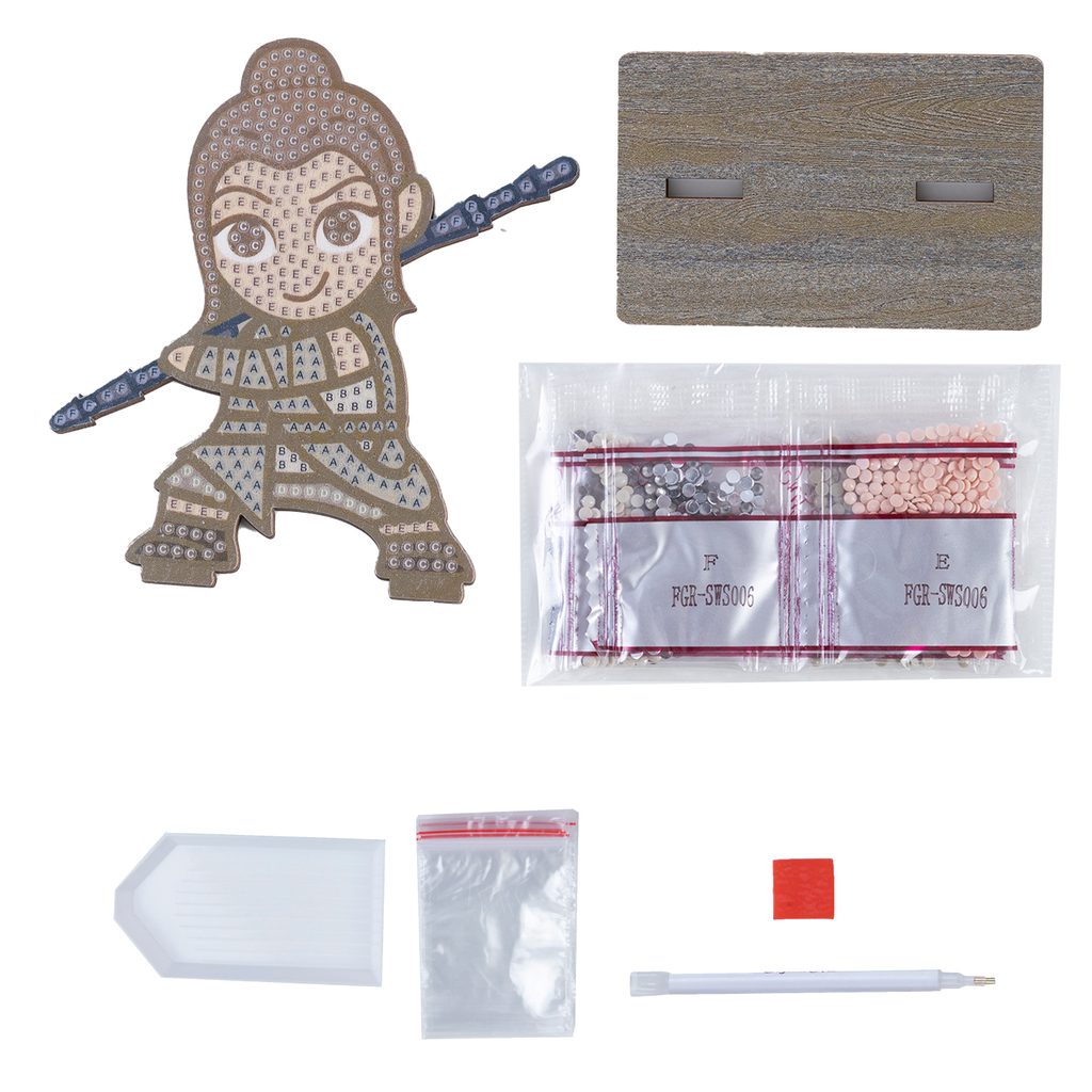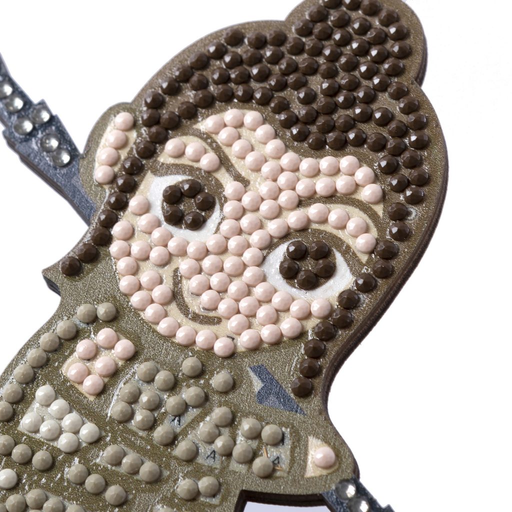 Create a figure of Ray from Star Wars using the technique of diamond painting, meaning gluing colourful little stones onto a pre-prepared design. The individual colours that you need to use are marked on an adhesive wooden board in the shape of the figure. Just pick a design, grab an applicator and start crafting. When the work is done, remember to press the stones evenly onto the board (e.g. with a book or a chopping board) to make sure that they are glued everywhere and with the same quality. Applying the stones is very easy. You can scoop up a bit of wax from the wax pad into the tip of the applicator, the diamonds will then hold in the applicator nicely. You can insert the finished product into the wooden stand included in the pack to display your piece. The kit contains a self-adhesive wooden board with a template, a wooden stand, colourful stones ("diamonds"), an applicator, a wax pad and a tray for diamonds. Diamond painting is a great form of crafting with older children. It helps develop their patience and concentration. Due to the size of the diamonds, crafting should only take place under adult supervision. Not suitable for children under 3 years of age.