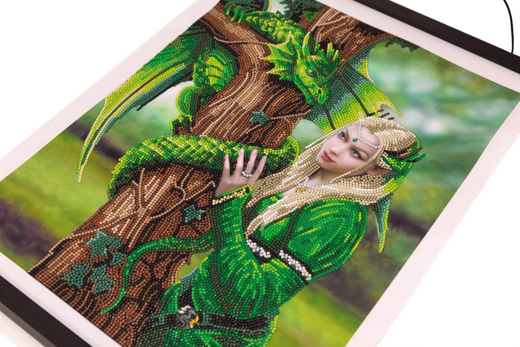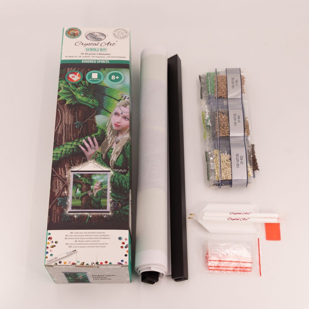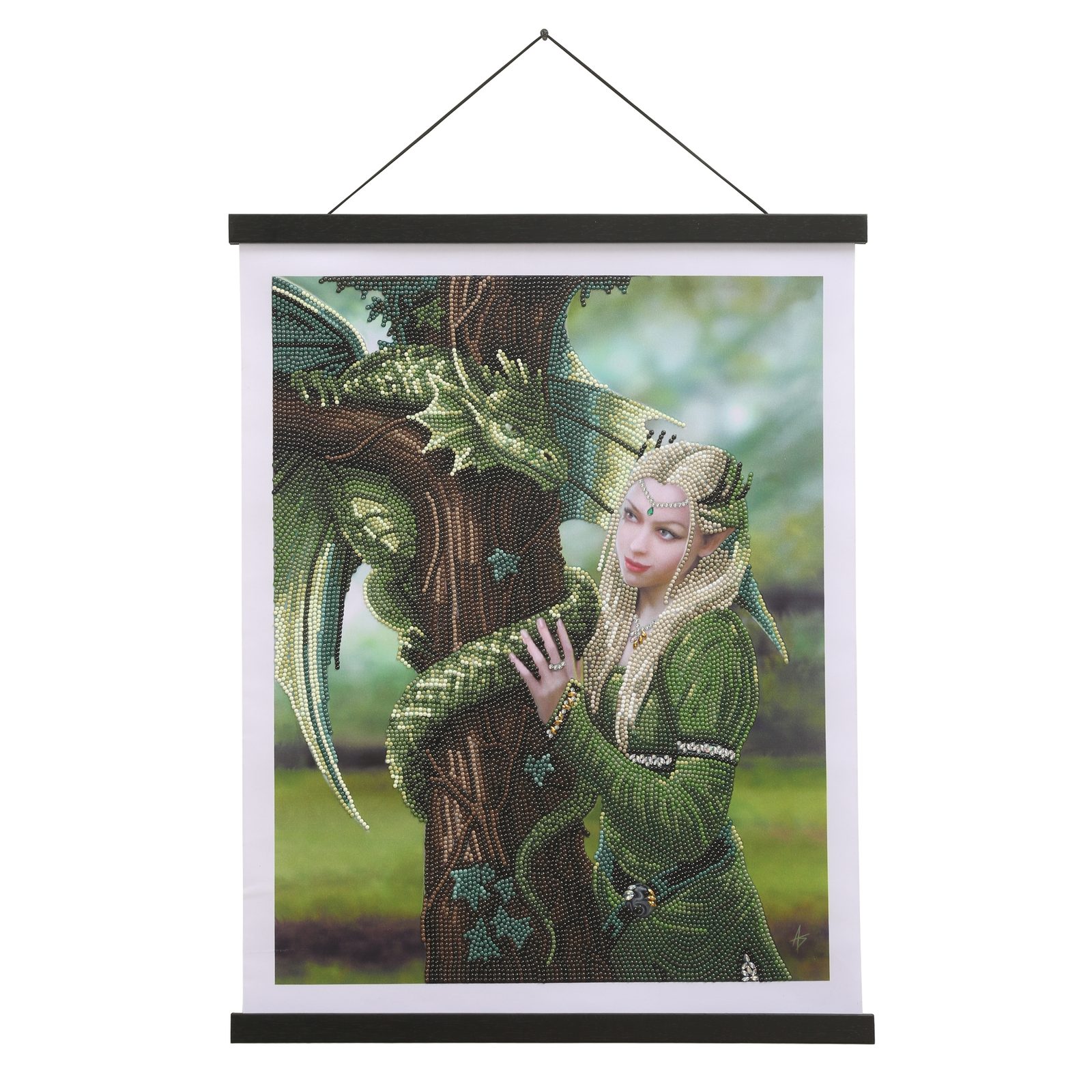 Create a picture of a fairy with a dragon using the technique of partial diamond painting. The picture on canvas is firmly secured in two wooden hanger bars. The fine details of the picture are drawn and you’ll paint the rest of the structure yourself by gluing colourful little stones onto a pre-printed design. On the canvas, numbers mark the individual colours that should be used and bags with stones of the corresponding colour are marked as well. Everything is also written down on the caption included. You don't have to worry about running out of stones or missing some, the package contains a bit more stones of each colour than needed. In short, all you have to do is choose a design, pick up an applicator and start crafting. When the work is done, remember to press the stones evenly onto the canvas (e.g. with a book or a board) to make sure that they are glued everywhere and with the same quality. The kit includes self-adhesive canvas with a pre-printed design and a frame, coloured stones (or "diamonds"), tweezers, an applicator, a tray and a wax pad.