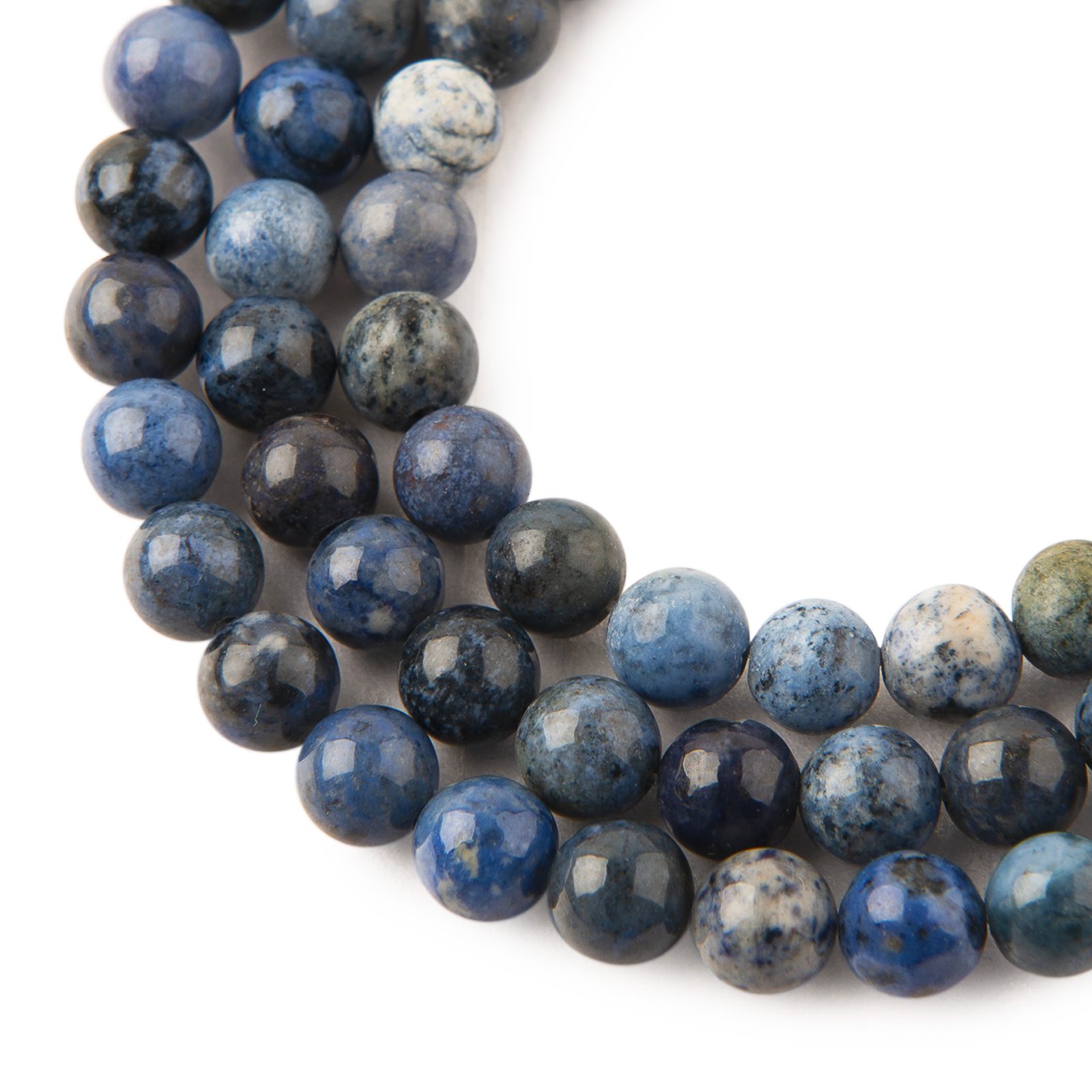 Dumortierit (dumortierite) ve velikosti 6 mm údajně u svého nositele podporuje schopnost komunikace a vyjadřování. Usnadňuje mu tak lépe vyjádřit sám sebe jasně a sebevědomě, též vyjádřit své myšlenky a pocity. Má modrošedou barvu, jeho odstín se ale může lišit od světle modré až po tmavě modrou. Říká se, že má na svého nositele především harmonizační účinky. Lidé jej dále vyhledávají, neboť prý podporuje jasné myšlení a odstraňuje negativní myšlenky a omezené vzorce chování. Bývá také často spojován s otevíráním třetího oka. Každý korálek je originál, a proto se může lišit o cca 0,5 mm. Více o dumortieritu si přečtěte v našem článku o dumortieritu.