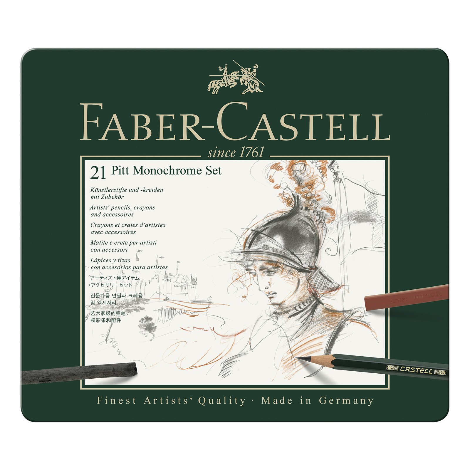 Faber-Castell set of 21 Pitt Monochrome drawing tools is packed in a practical tin case. This selection of professional pencils, pastels, chalks and charcoal for drawing is suitable for beginners as well as advanced artists and in addition, it also contains a moldable eraser and a paper diffuser. Thanks to the durable case, this set is also suitable for travelling. Graphite pencils, pastels, charcoal and chalks are indispensable for professional artists, drawers, graphic designers as well as for those who are just starting with drawing. Thanks to a wide array of different hardness grades and sizes of lead, it’s possible to draw perfect shading and details as well as contrasts.