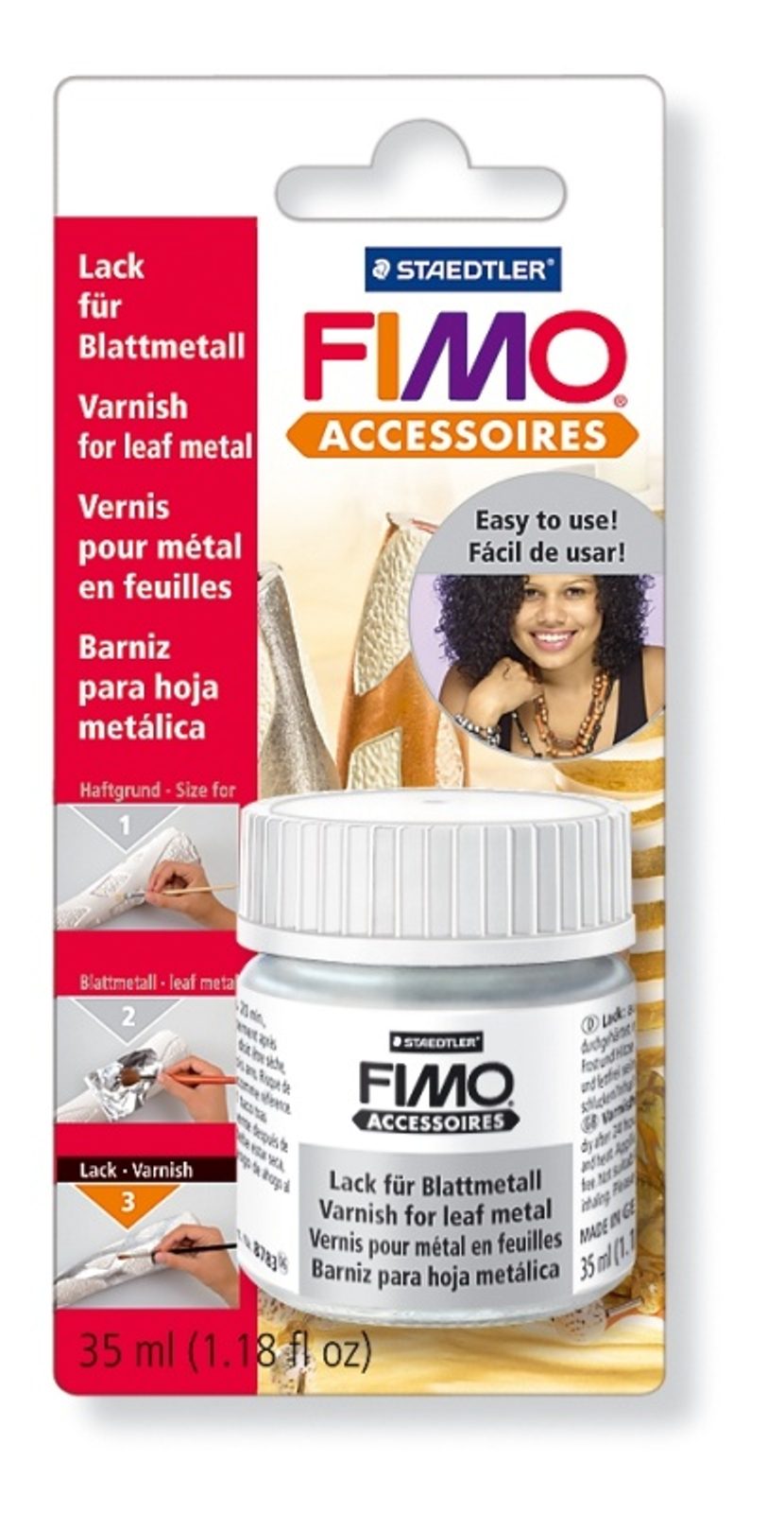 FIMO varnish for leaf metal glossy 35 ml is an ideal tool for working with leaf metal. Apply the varnish very lightly to a clean and dry surface. It will then protect your products against adverse external influences and ensure their long-lasting life and quality.