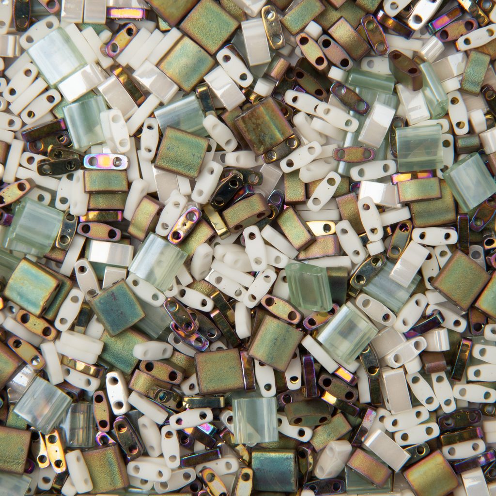 Miyuki Tila freeform mix mixed nuts je směs oblíbených japonských skleněných rokajlových korálků. Tyto korálky v hranatých tvarech se vyznačují vysokou kvalitou, leskem a tvarovou pravidelností. Směsi obsahují klasické čtvercové korálky TILA i menší obdélníkové Half TILA v různých barvách a velikostech. Rozměry korálků ve směsi jsou 4,5 x 2 x 1 mm, 5 x 2,5 x 2 mm a 5 x 5 x 2 mm. Korálky mají zaoblené hrany a dva průtahy, které jsou dostatečně velké pro provlečení oblíbenými elastickými návlekovými materiály jako je elastická lycra nebo elastomer. Z těchto zajímavých korálků můžete tvořit například jednoduché náramky. Z jedné směsi je možné vytvořit až 3 dámské náramky. Využití tyto korálky najdou i v rámci šitého šperku v kombinaci s vlákny typu Nymo a Fireline či jinými rokajlovými korálky.