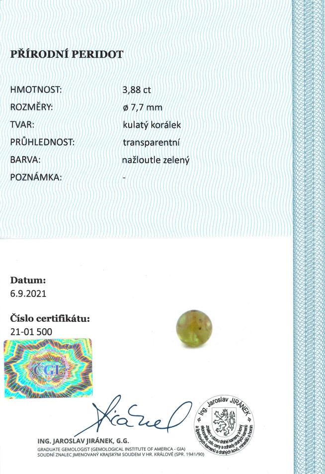 Olivine 7 mm, or peridot, brings about the feelings of deep love and works as a protective crystal, because it reflects negative energies. It supposedly subdues the feelings of jealousy and self-pity and harmonizes relationships with people around us. It deepens our feelings of love. Country of origin: China Supplier: Korálky.cz s. r. o.