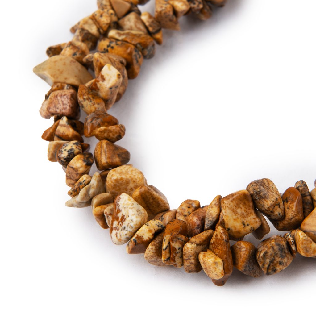 Zlomky z minerálu Jaspis obrázkový v délce 80 cm. Broušený jaspis obrázkový matný údajně svého nositele uzemňuje a propojuje ho se zemí. Má velmi pestrou škálu barev, které dohromady vytvářejí pěkné abstraktní obrázky. Jeho povrch je matný. Tento kámen prý pomáhá při rozhodování a získávání jasnosti. Posiluje také údajně intuici a vnímání, což nositeli může pomoci zvolit si správnou cestu či se lépe orientovat v životních rozhodnutích. Podle legend podporuje představivost a schopnost vyjádřit nápady. Každý korálek je originál, a proto se může lišit o cca 0,5 mm. Více o jaspisu obrázkovém matném si přečtěte v našem článku o obrázkovém jaspisu.