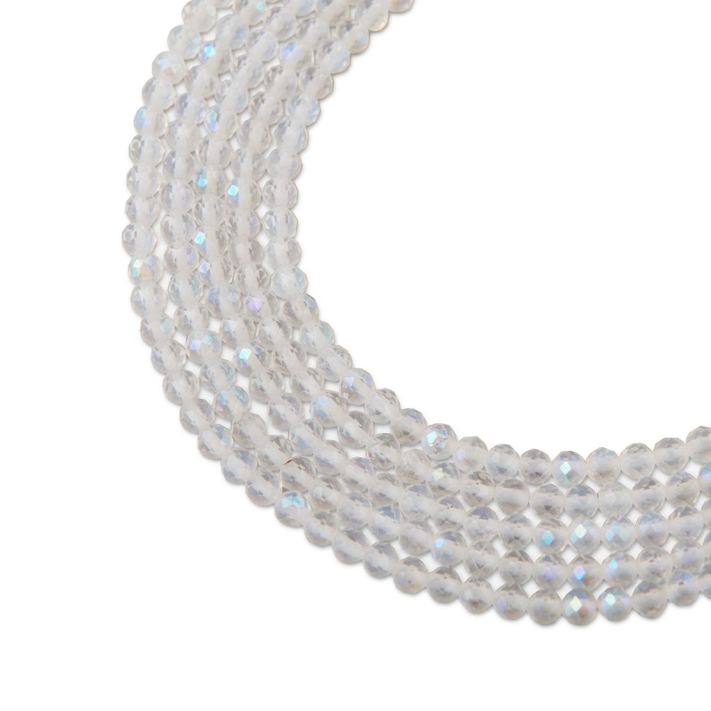 Jemně broušený lesklý křišťál ve velikosti 3 mm údajně u svého nositele podporuje vitalitu a posiluje jeho energii. Má průhlednou barvu, která symbolizuje průchodnost světla. Tento kámen prý působí pozitivně na vyšší vědomí, intuici a duchovní roviny. Říká se, že dovede zklidnit mysl a zároveň má ochranné účinky proti negativním energiím. Podle legend bývá spojován s intuicí a duchovními rovinami. Pomáhá prý také s jasnovidectvím a rozšířením vědomí. Každý korálek je originál, a proto se může velikost mírně lišit. Více o křišťálu si přečtěte v našem článku o křišťálu.