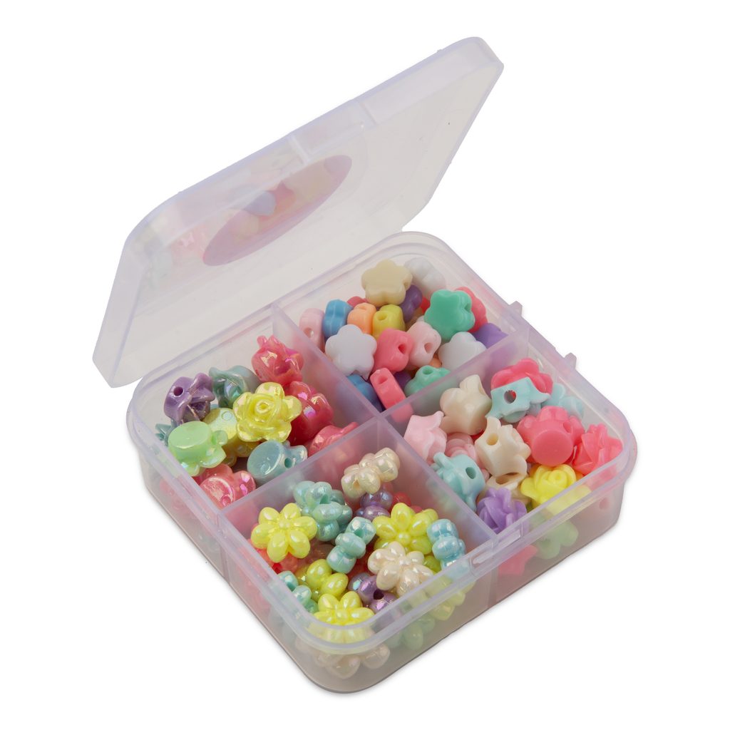 Sada barevných akrylových korálků s motivy květin se skvěle hodí nejen pro tvoření s dětmi, ale také pro tvorbu trendy barevných šperků nebo festivalových doplňků. V sadě najdete 4 druhy korálků v různých pastelových barvách. Ty jsou uskladněny v praktické uzavíratelné krabičce s přihrádkami, díky které se vám jednotlivé druhy korálků nepromíchají. Velikost korálků je cca 12 mm a mají šířku průtahu cca 1,5 mm (může se lišit kus od kusu). Balení obsahuje přibližně 115 korálků s motivem plochých i 3D kytiček.