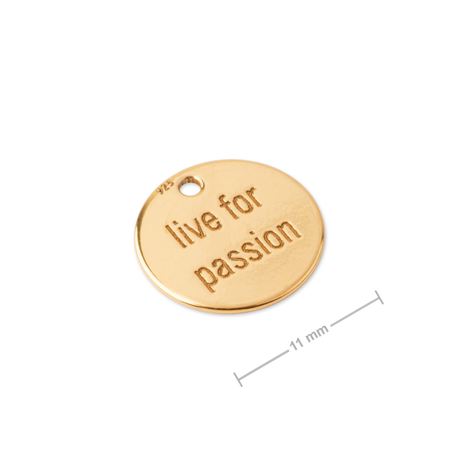 Silver pendant live for passion gold plated No.1089 we recommend attaching to a chain or a bracelet with subtle design. It also goes well with trendy jewellery made from Shamballa cords. This pendant is made from high quality silver that will guarantee its longevity and colour fastness.