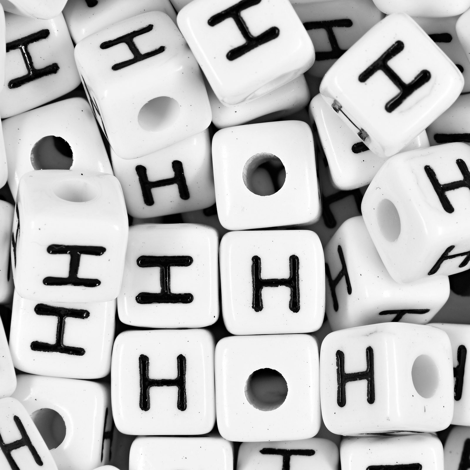 White plastic bead 10 mm with letter H is very light and cube-shaped. Letters are engraved on four sides of the cube and they are missing only from the sides with wide center holes. The bead is suitable for making friendship bracelets with any wording you want.