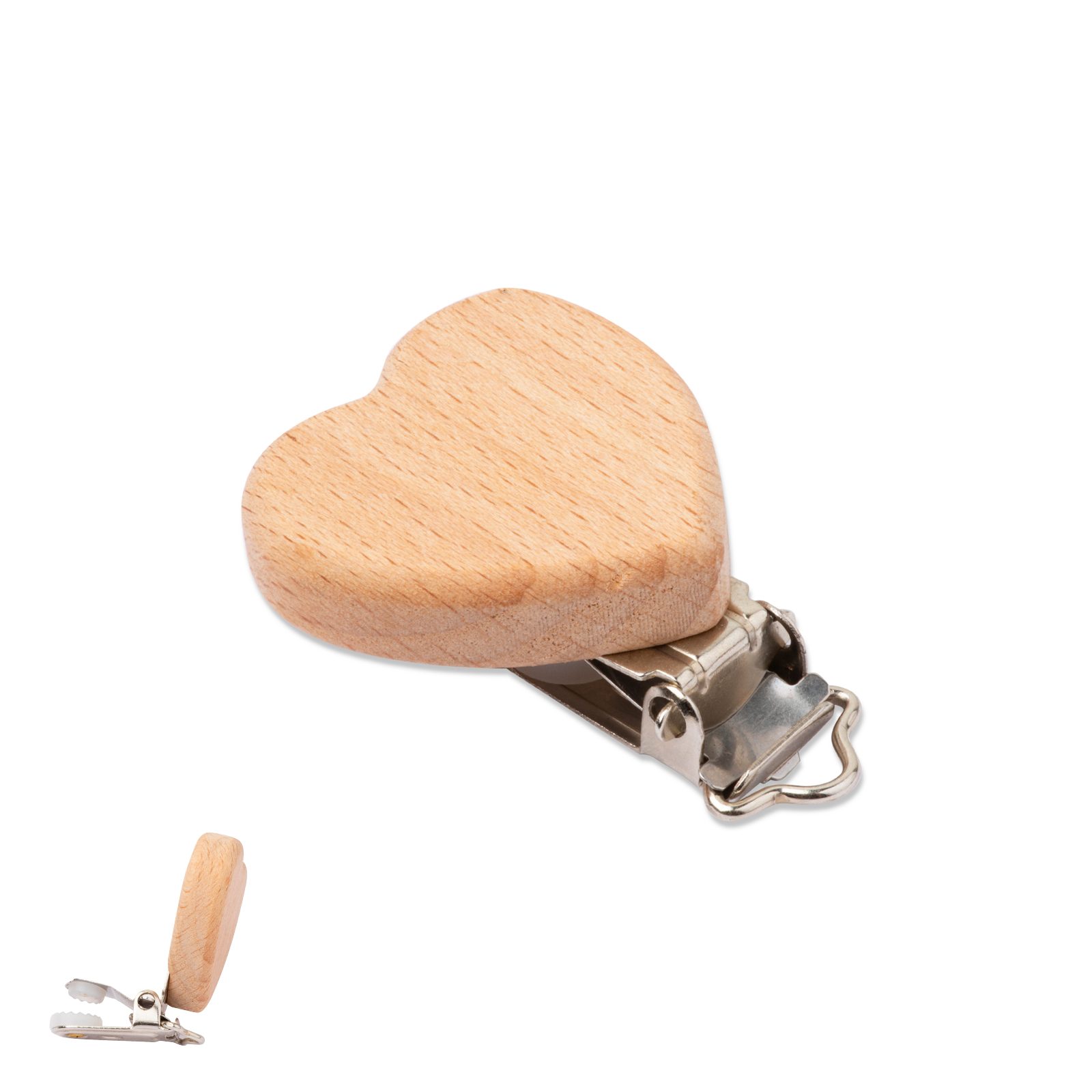 Wooden dummy clip 37x37x10mm heart with metal buckle is an accessory used for making decorative dummy chains for babies. You can easily attach this clip to the baby’s clothes and using a nylon satin cord and wooden or silicone beads, you can make a beautiful and practical accessory that will ensure that you won’t have to look for your baby’s dummy all over the house. Metal clip is made from common metal and that’s why you need to take care of it to keep it dry and clean, as it could get rusty. But it’s stronger than buckles made from other materials.
